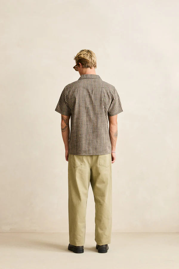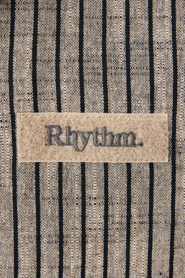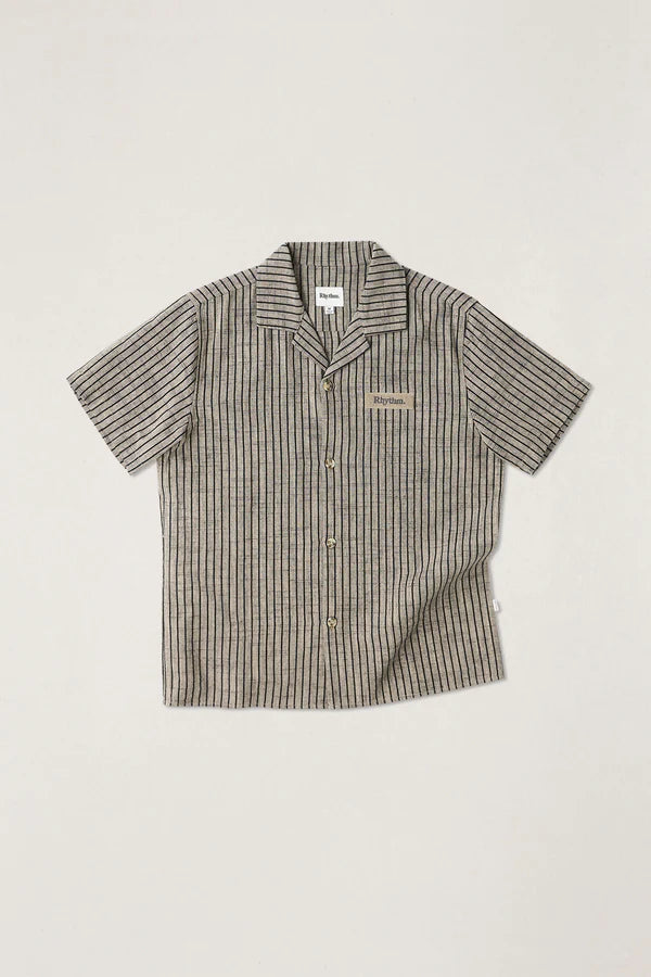 The Texture Stripe SS Shirt in Natural is a relaxed short-sleeve shirt, woven with a soft stripe and finished with a Cuban collar. Tortoiseshell buttons and Rhythm trims complete this easy, elevated piece.
