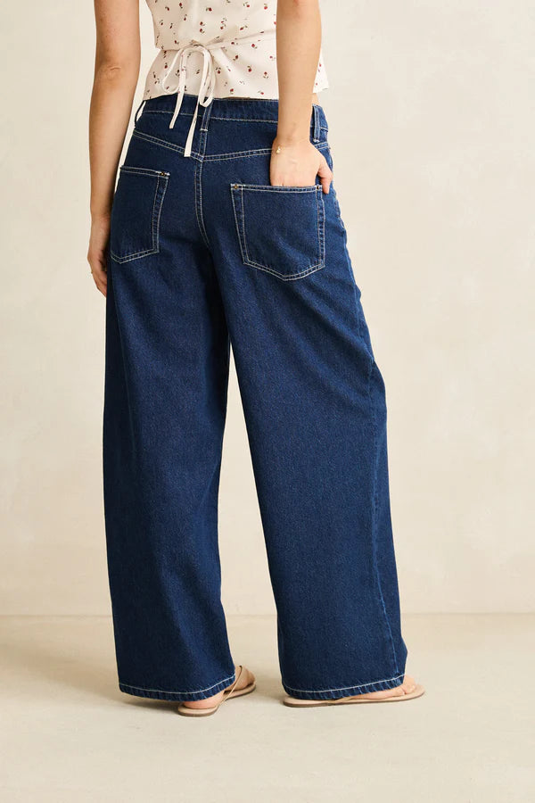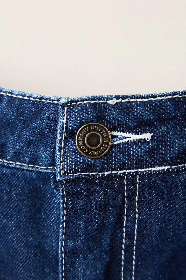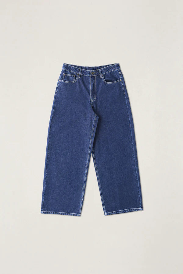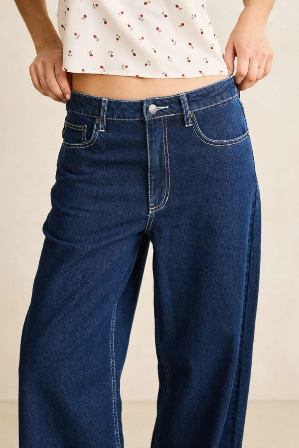 The Zali Boyfriend Jean in Indigo is a relaxed low-rise style with a wide leg. Featuring pocket details and a button fly, it offers an easy vintage fit with Rhythm trims.